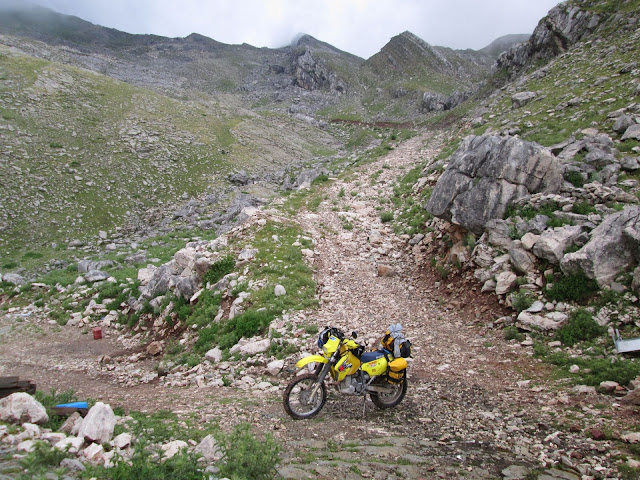 Para cuando llegué arriba, más helado y mojado que un pingüino, la tormenta se había disipado. Disfruté poco de las vistas y del subidón de adrenalina tras franquear el collado, una lástima, pero es que se hacía tarde y no tenía nada claro si la bajada hacia el siguiente valle estaría despejada. De hecho, nada más empezar el descenso el camino empeoró súbitamente. Tocaba sufrir unos kilómetros, pero a lo lejos se distinguía una pista decente. Lo conseguiría. O no... El tramo en bajada sobre pedruscos mojados fue exigente